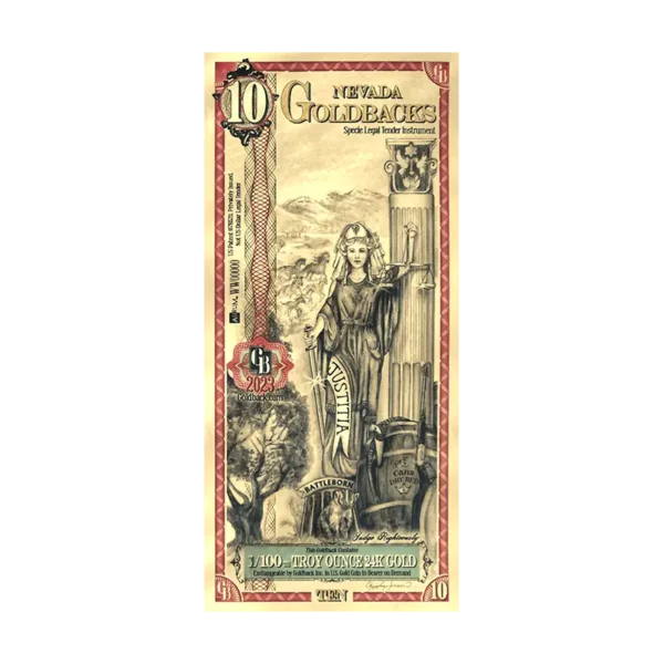 The 10 Nevada Goldback is a gold-backed voluntary currency infused with 1/100th of a Troy ounce of 24K gold, offering both intrinsic value and artistic beauty. Crafted using cutting-edge vacuum deposition technology, each note contains real gold, making it a unique alternative to traditional fiat currency.